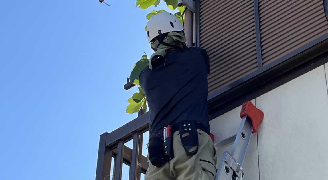 2階の軒下あたりまで長く伸びてしまったツルも、長ばしごに登ってしっかり刈り取ります。