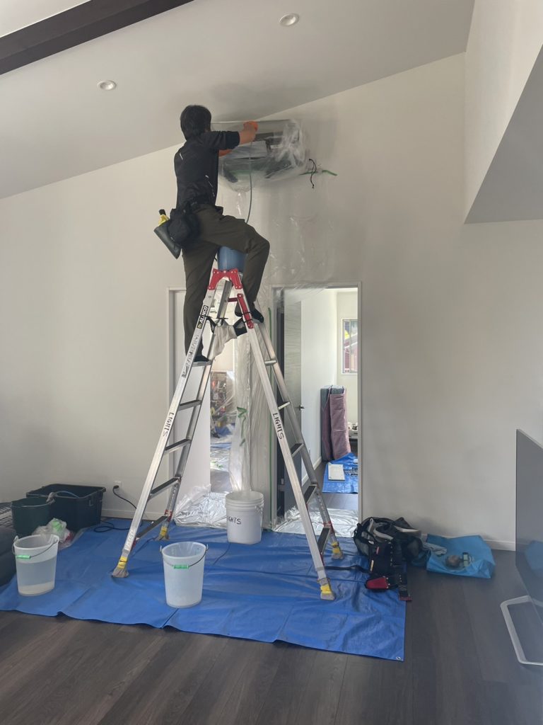 お掃除エアコンは一般のエアコンよりも分解作業に手間はかかり、下の写真のエアコンに関しては高所作業でしたが、お掃除エアコン4台、一般エアコン1台のクリーニング作業は無事に終了致しました。