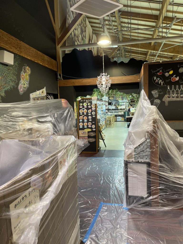 写真は作業場の養生の様子。沢山の商品が陳列された場所でしたので養生もしっかり👆 もちろん一般のご家庭のエアコンクリーニングの場合もしっかり養生させていただきます。我々掃除屋なんで汚すわけにはいきません😁