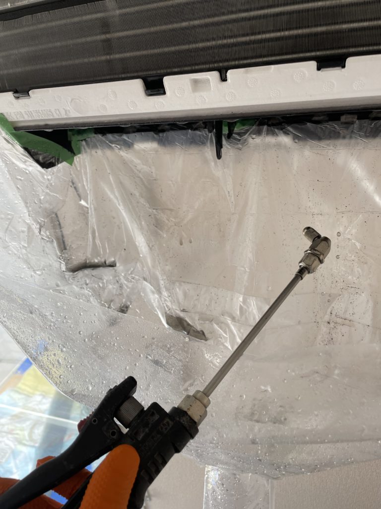 ライツではしっかり分解洗浄!パーツ外して表も裏もきちんと洗います(トップの写真)。内部は専用洗剤を吹きかけ、高圧洗浄機でしっかり洗い流します(下の写真)。洗い流した汚れが下の写真のバケツの中の黒い水😁 スプレー缶かけてもしっかり洗い流さないと、この汚れが内部に残っているということです😨