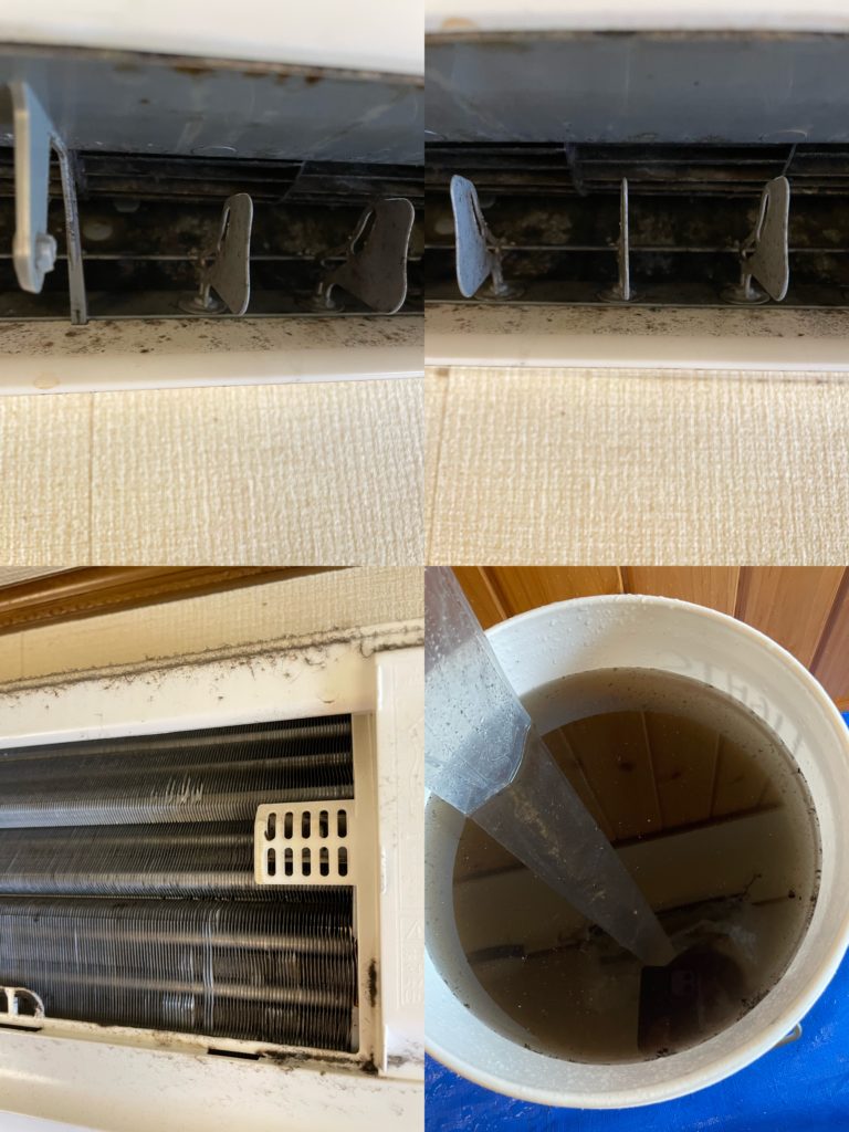 エアコンクリーニングって、業者さんによっては分解せずにフィルターと外まわりの目に見える部分を拭くだけとか、内部も市販の洗浄スプレーをかけるだけとかあるみたいです。ただ、この方法では内部のカビやホコリは全然とれません😨