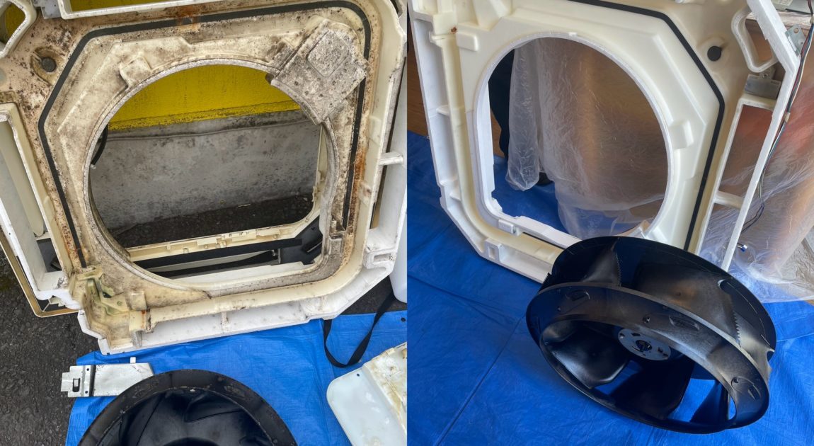 某中華料理屋さんの天カセエアコンをクリーニング! トップの写真はドレンパンのビフォーアフター😊