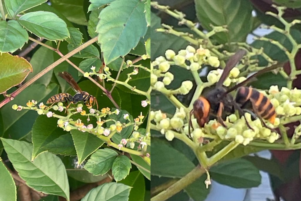 アシナガ蜂とスズメ蜂が…結構何匹か行き来してたな🐝  8月〜10月は巣が大きくなり、ハチの数も多く攻撃的らしいです👆気をつけましょう❗️