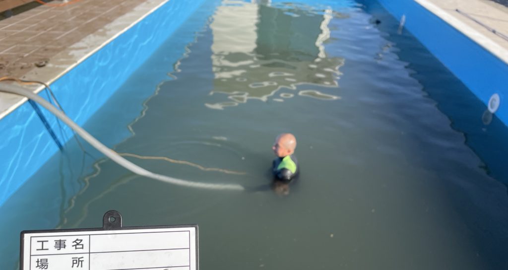 それならばということで、汲み上げ用ポンプを抱えて入水😭 ヒートポンプはこれから設置なんでウェットスーツ着てても寒い🥶