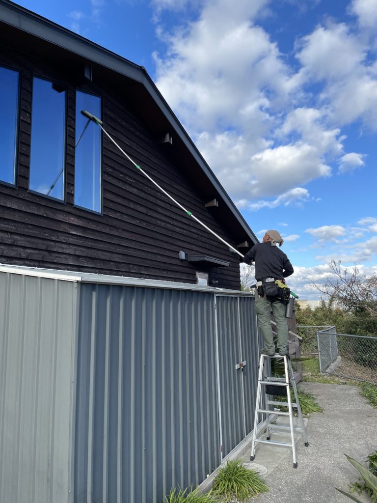 こういう窓はポールを使ってクリーニング😊 物置があるから脚立やスライダーは立てられない😅