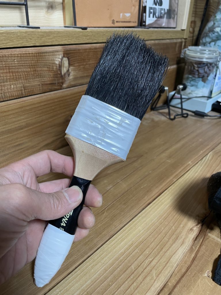 ちなみに、ビニールテープを巻くのは、万一落としてしまったり、家具などに当たってしまった際に、傷つけてしまったり、刷毛の柄の塗料が付いてしまうのを防ぐため☝️ 親方の教えでございます😊