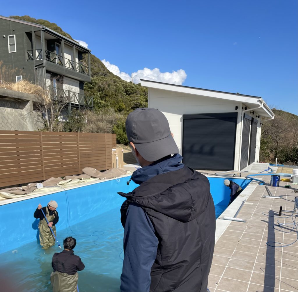 こちらのプール、プールの蓋の役をするシートがなかなか到着せず、館山の大西風の影響で底にかなりの砂が溜まってしまいました😣 我々は建物の管理のご依頼をいただいているのでアレなんですが…やっぱり気になります。せっかくの新築の別荘ですから我々に出来ることは協力させていただきます🫡