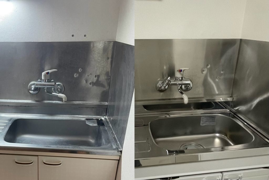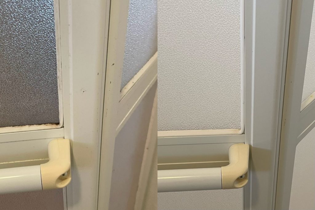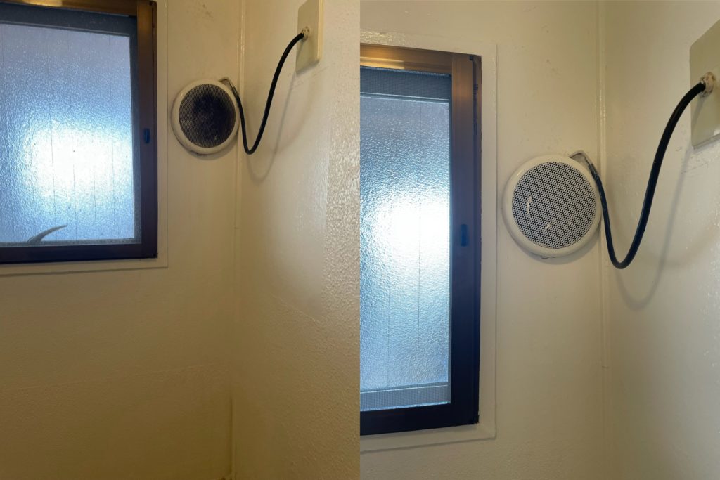 左がビフォー、右がアフターです。シンク周りも輝きが違うでしょ、お風呂の換気扇カバーも真っ黒から真っ白に😁