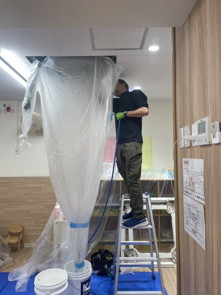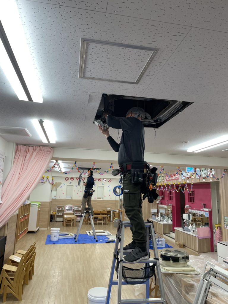 今日もMJさんにお声掛けいただき、いつものメンバーで保育園さんのエアコンクリーニングでした。天カセ4方向を7台、1方向を1台、天吊り1方向を1台の計9台。