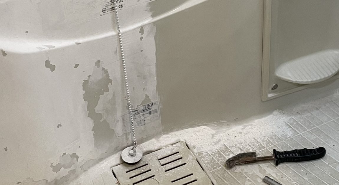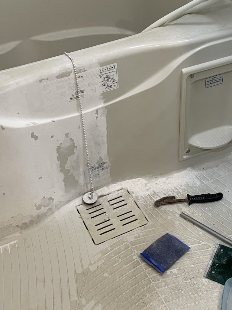 だんだんキレイになってきました(^^) 浴槽右半分が磨いたところ。この差があります。