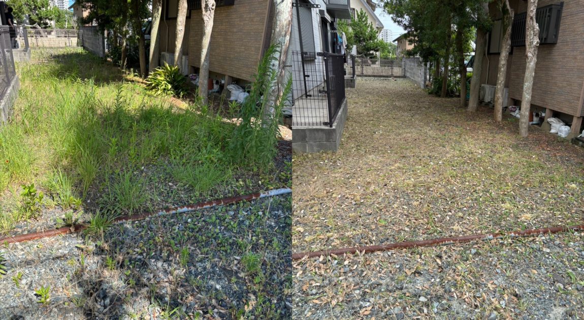 草はそれ程伸びてなく、曇りだったんで作業負担は軽いのですが、砂利場でアパートの駐車場もあって車なんかも止めてあり、飛び石には要注意です❗️