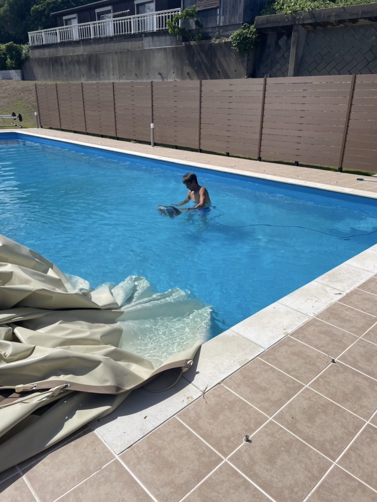 そして、午後からの別荘管理業務はプール掃除がメイン。オフシーズンの間掛けておいたシートを外して…コレがなかなかの重さでひと苦労😓あとはプールに入って淵の汚れ落としなどなど