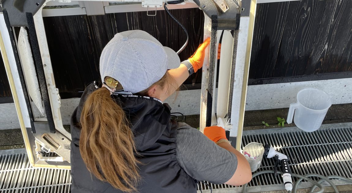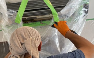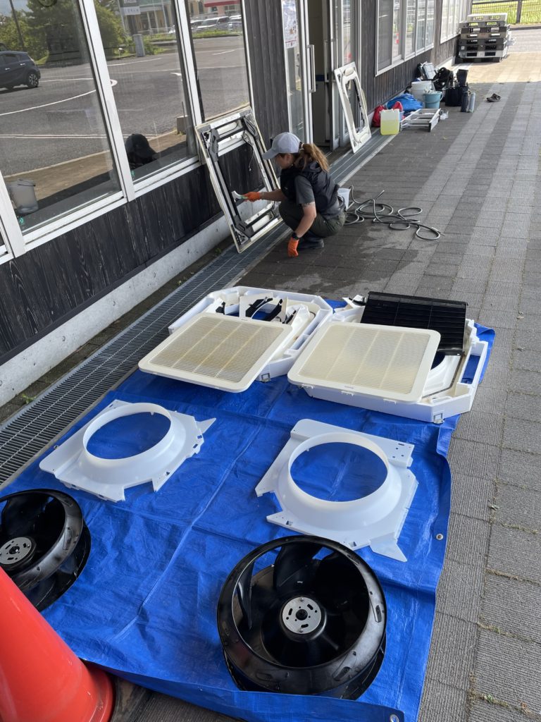 立ってるだけでもクラクラする暑さの中、皆んながんばりました! エアコンのパーツも5台分となると結構あるんですよねー😅 女性スタッフ1人で黙々と洗ってくれました。お疲れ様〜!