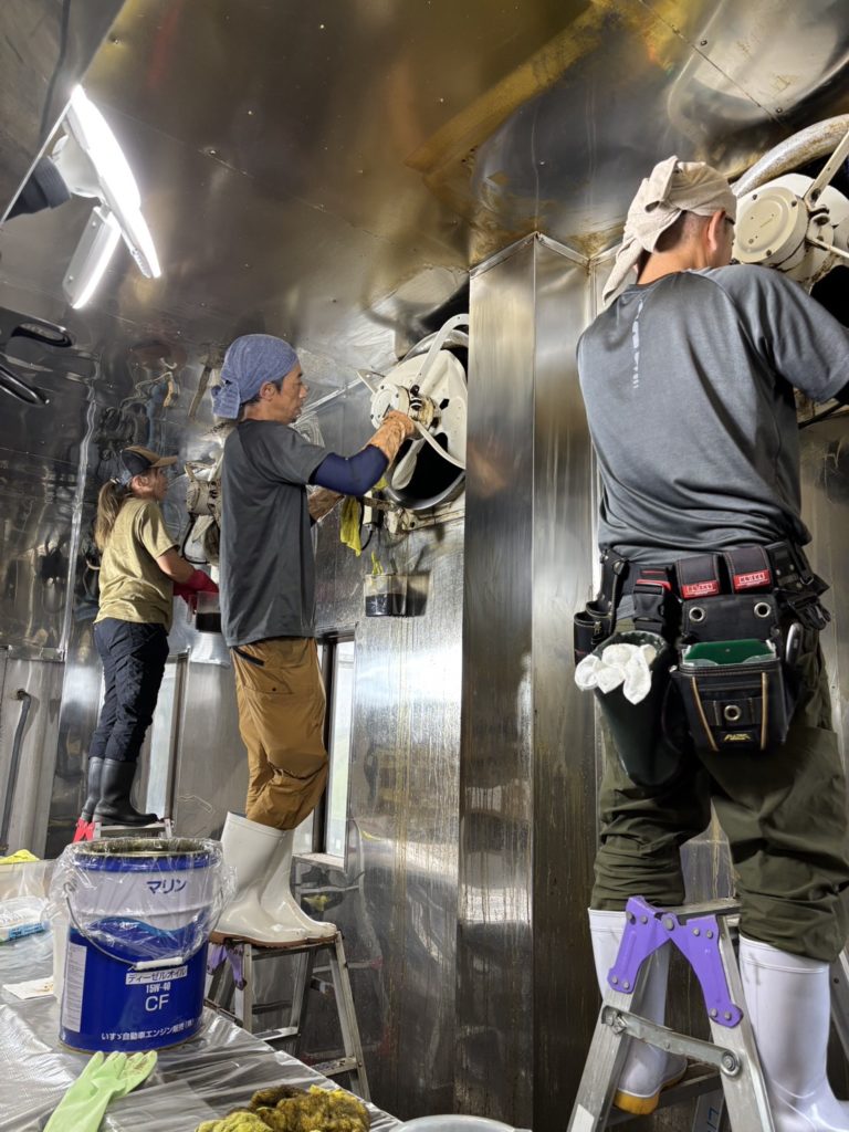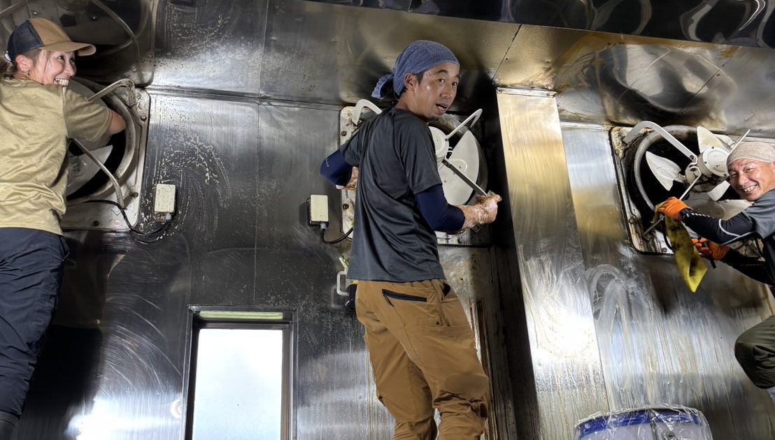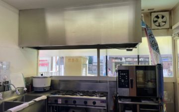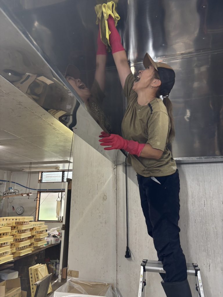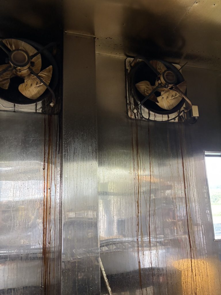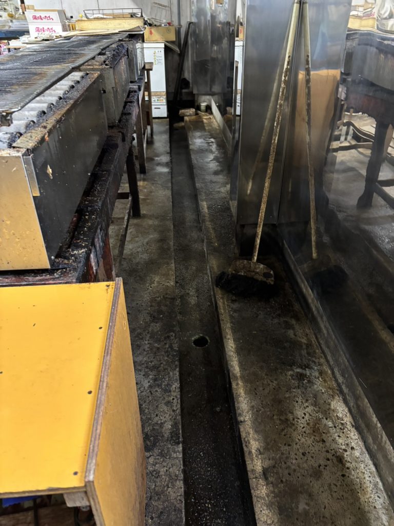 ウナギ加工の厨房で換気扇、フード、床周りを清掃させていただきました。