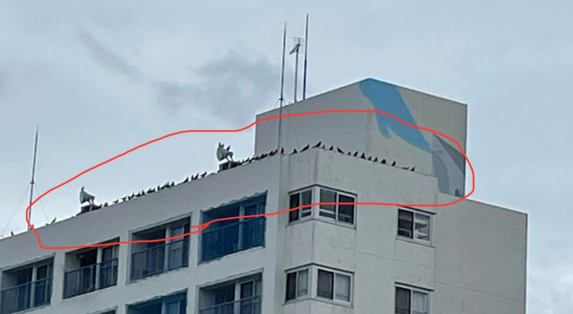 話しは変わり…今日、作業していた施設の近くのマンションを何気なく眺めていたら、マンションの屋上にズラーっと並ぶハト(トップ画)😨 MJさん、やっぱハト避けネットは必須ですね😕