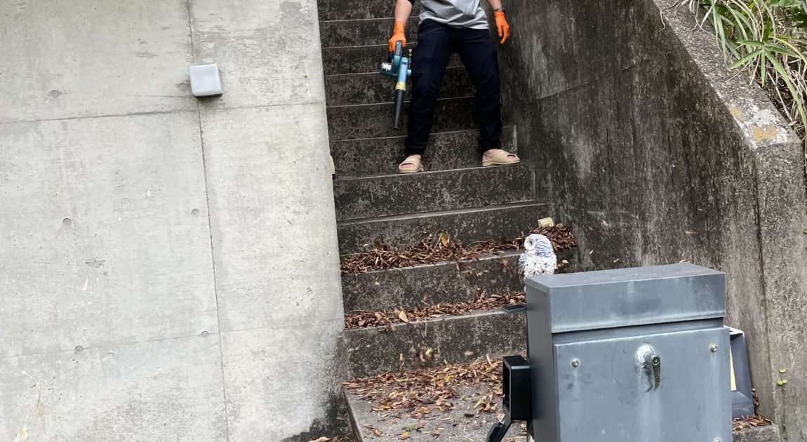 宿泊施設のアプローチの階段には落ち葉がたんまり😅 女性スタッフ、一生懸命落ち葉かき^_^