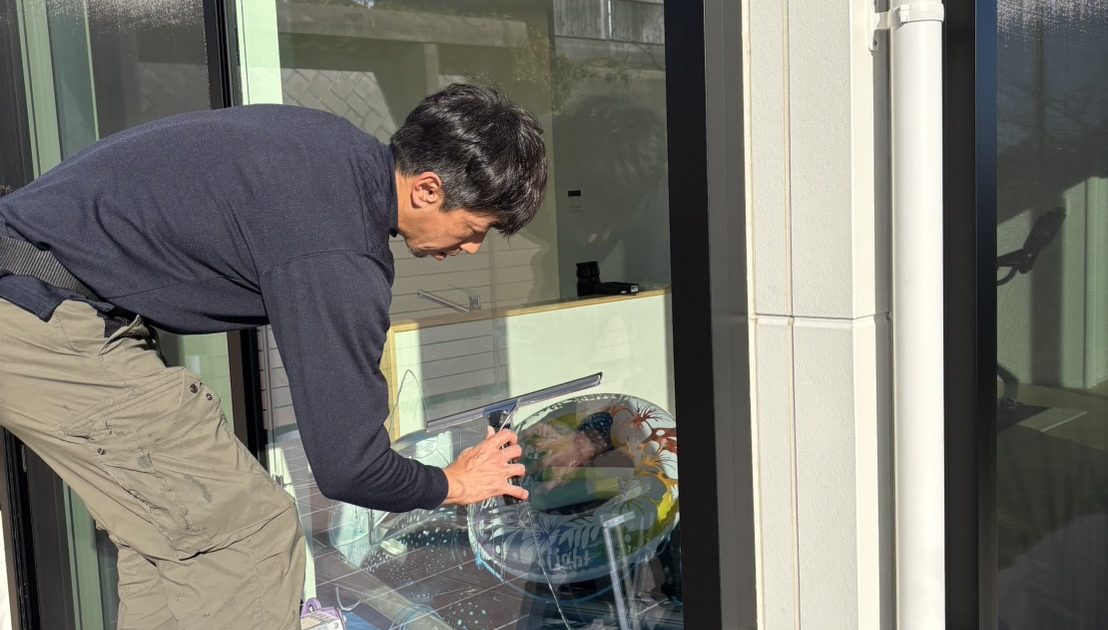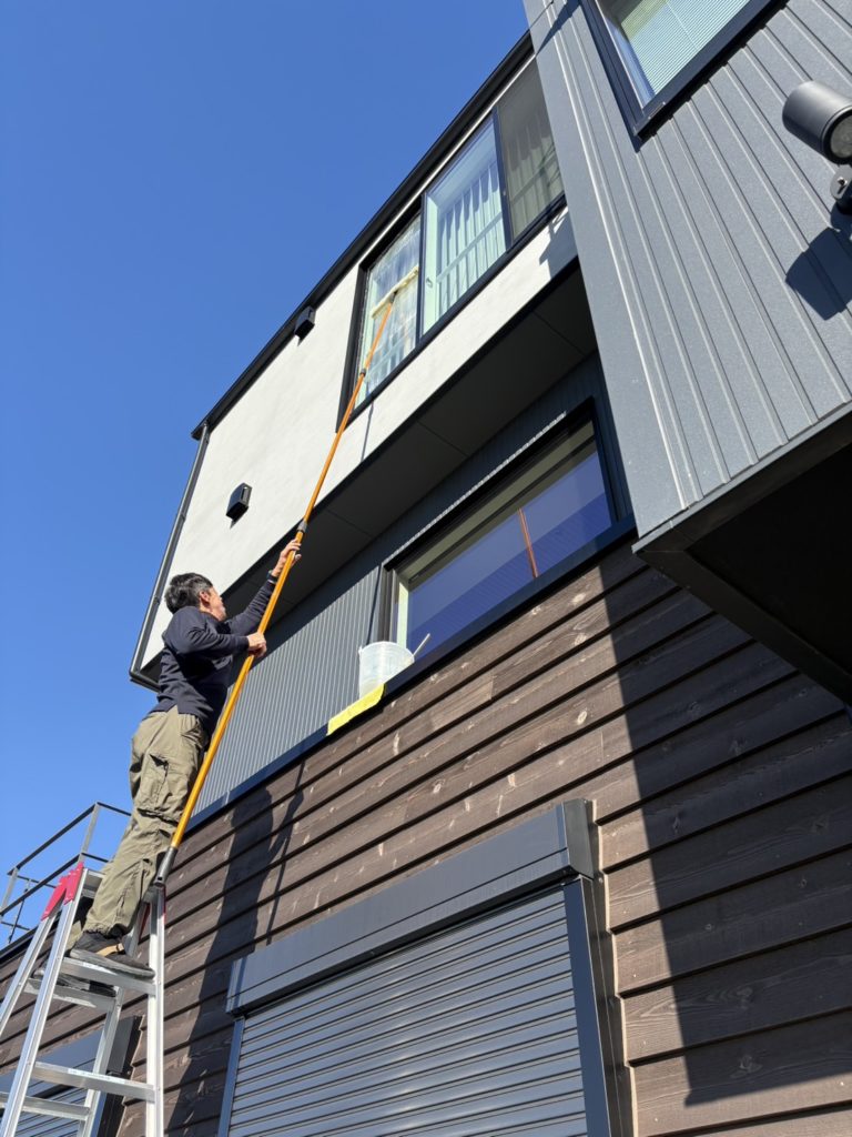この窓がねー😅 色々試行錯誤したんですけど、10尺の上で3段ポールで引かないといけないんですよ…ポール…あんま使わないからなぁ〜