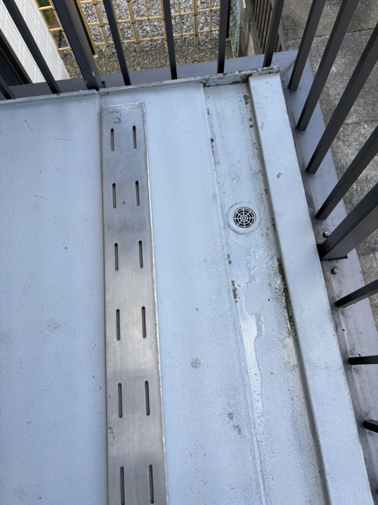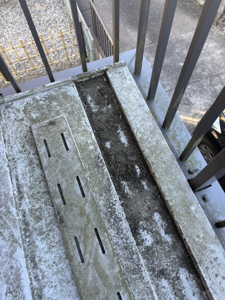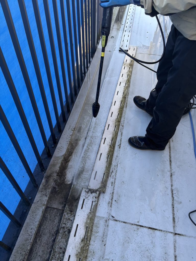 共用廊下の高圧洗浄。隣のお宅に飛び散らないようにしっかりブルーシートで養生します😊