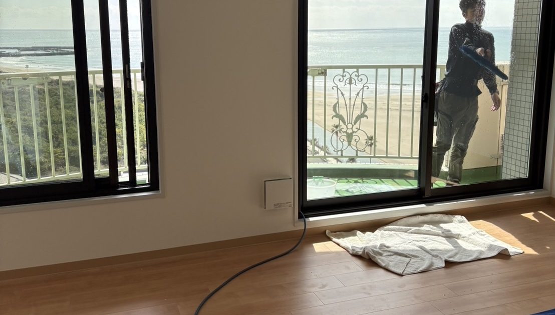 マンションのフルリフォーム後の清掃🧹 作業で出たホコリなどをせっせと落として拭きあげていきます😊2人で作業したからお昼くらいには作業終了! 御宿なんで移動時間が😅